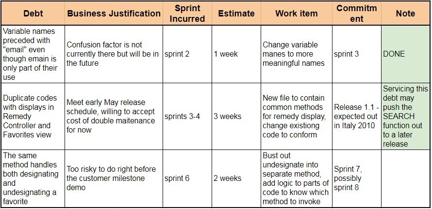 - Don’t let the problems build up – leave the code cleaner than it was before, control bugs and update Technical Debt List.
