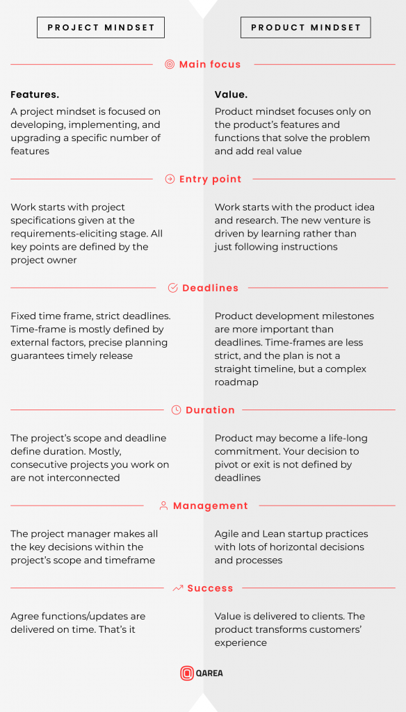 Product-mindset engages all the agents in co-creating value and committing to the goals beyond the deadlines. There is not one, not two, but many points assessing which you can decide which mindset defines the development of your startup. Here are some of them: