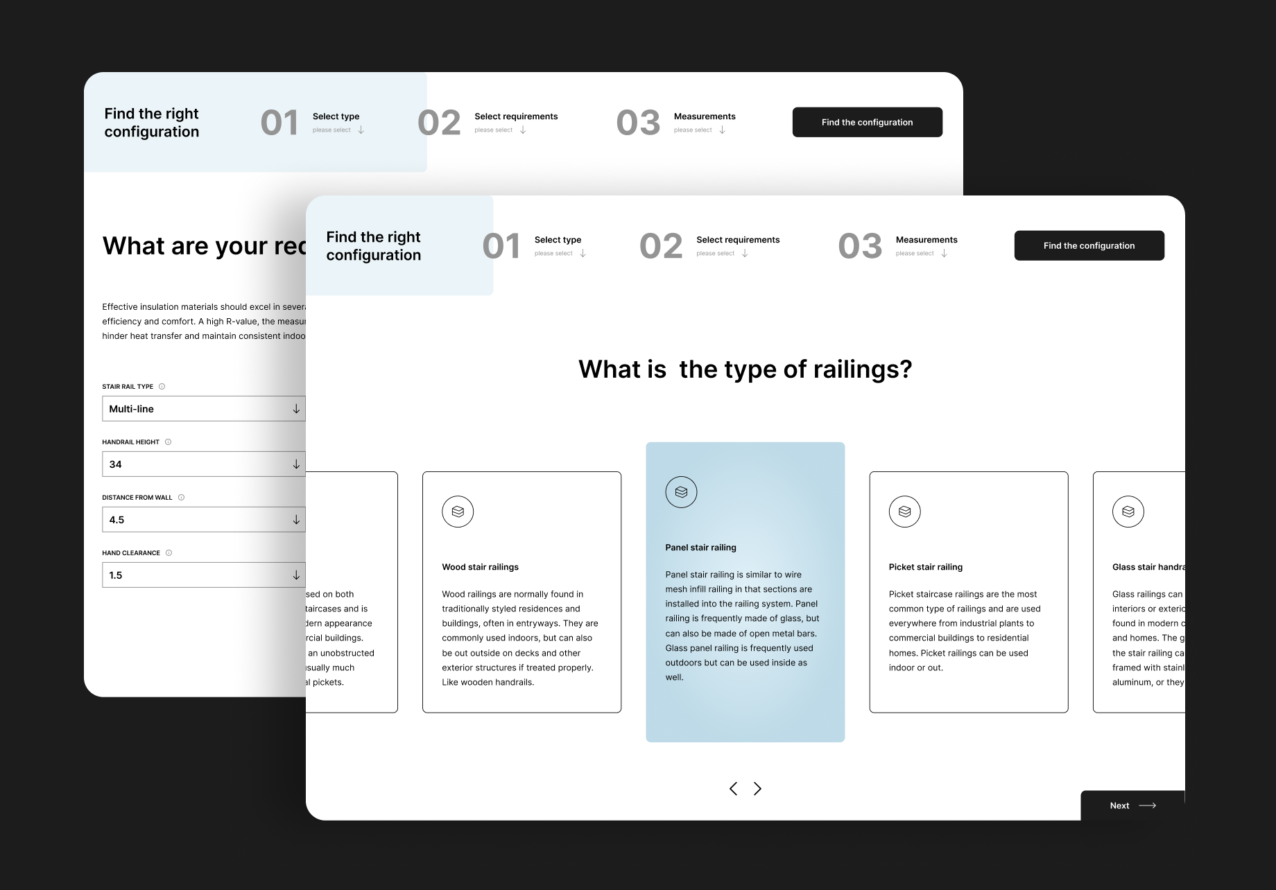 Our client of 3 years approached us with a request to develop a configurator that would allow users to build custom pergolas and railings by picking all the components individually and putting them together in one unit. The goal was to provide users with a visualization of the final product and the cost of all the parts that go into it.