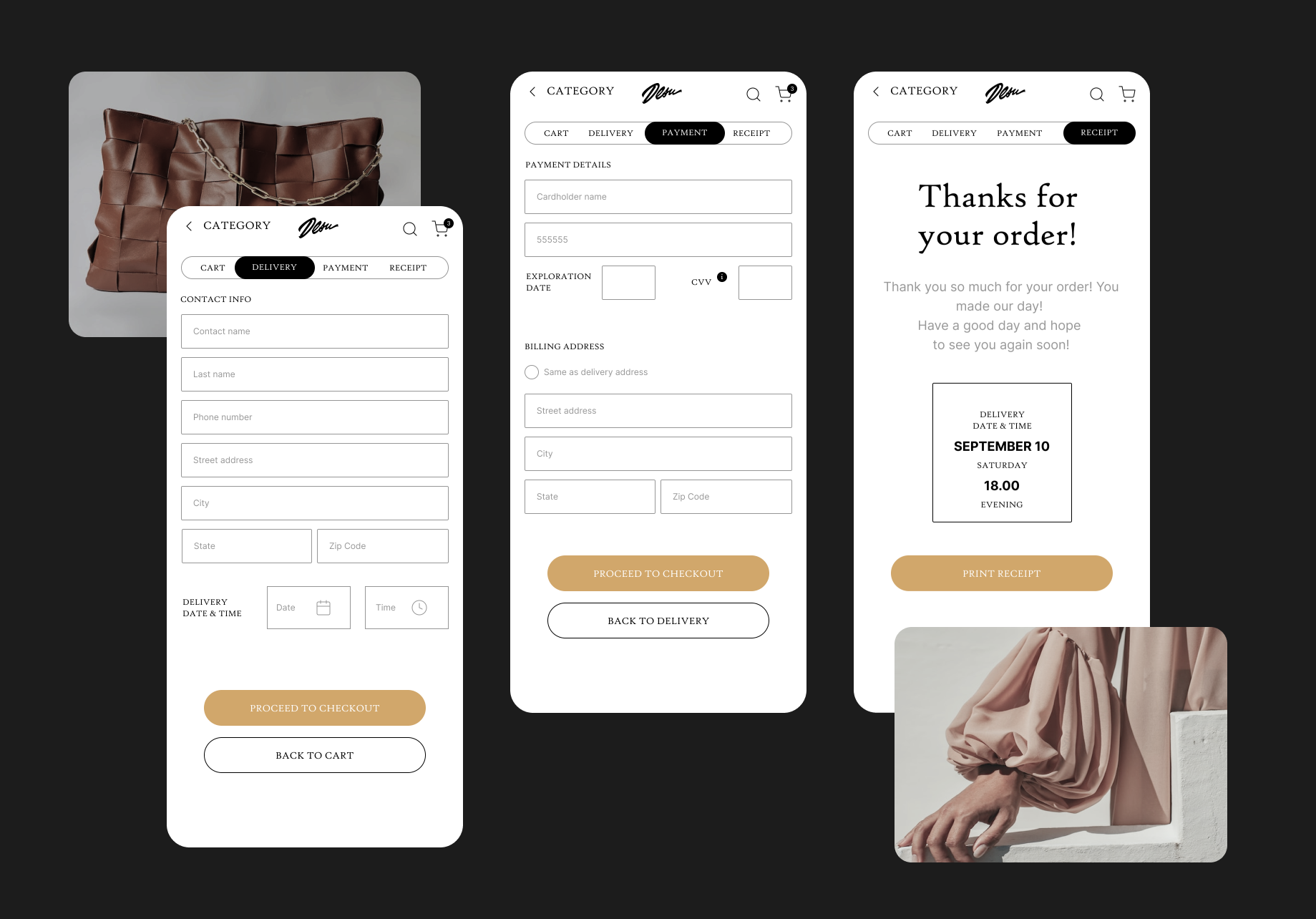 - Designed Checkout, Shipping, Stripe Payments, and My Account functionality screens;